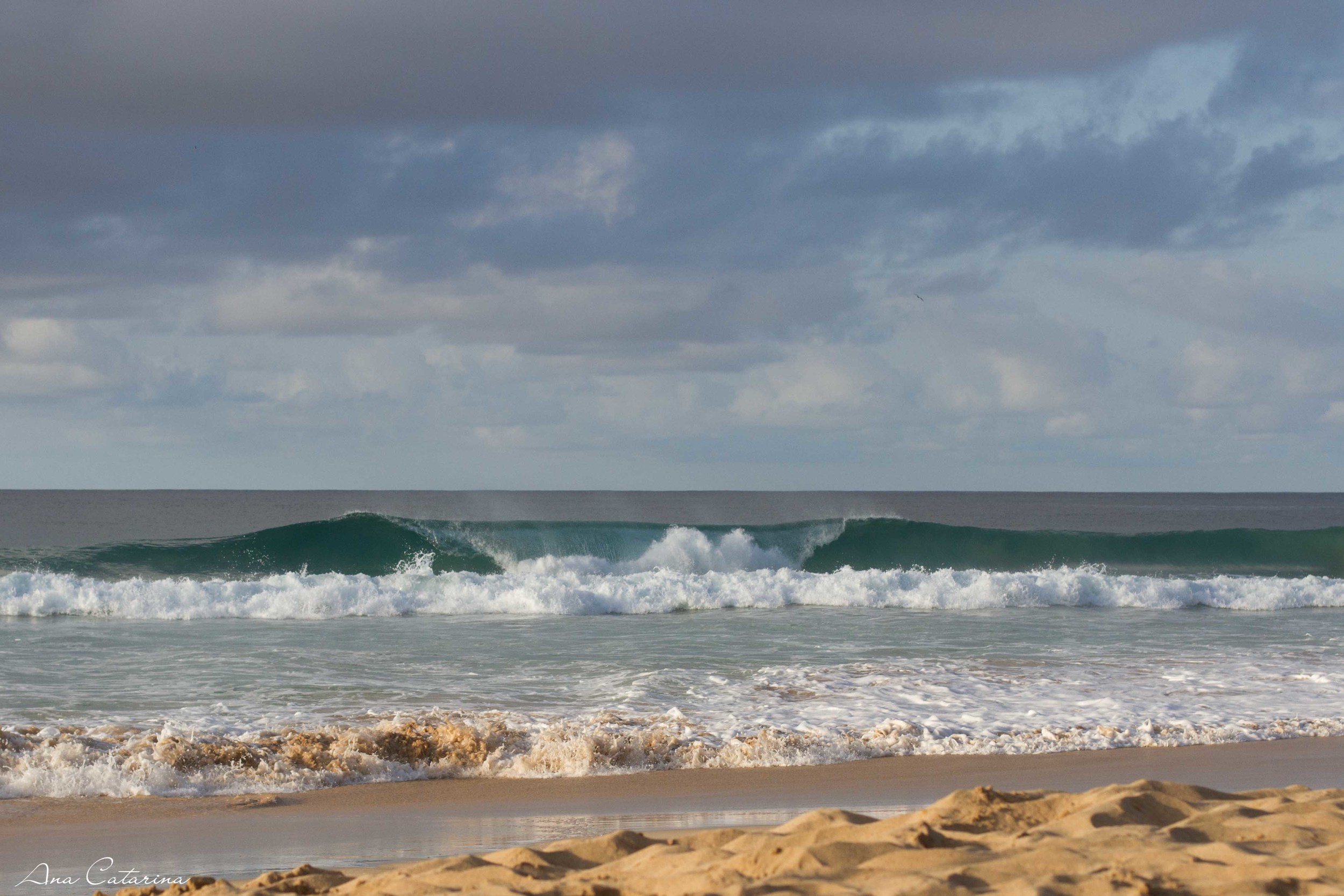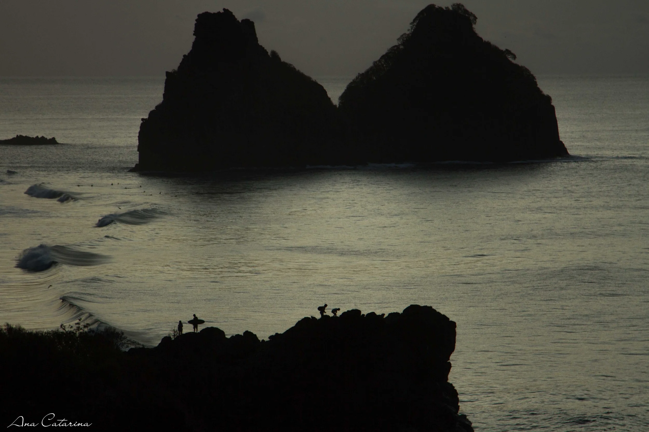 E minha recepção não poderia ter sido melhor! Esperei o amigo novo na esquina e lá fomos nós pra Cacimba do Padre, assim sem cerimônia alguma. Esse era o Junior, de Balneário Camboriú, frequentemente vinha à Ilha e, além de surfar, estava tirando a certificação para mergulhador. Ele virou minha companhia durante seus últimos dias na ilha, mais quatro no total, assim como o Daniel, de Ubatuba e que morava em Floripa. Bom, chegando na Cacimba ... eita! Um metro e meio de onda pesada, fechadeira. De cara, conheci o Iapa, um dos fotógrafos mais característicos de Noronha e dono da loja local clássica, a Neuronha, sentadinho no alto de uma pedra com uma 600mm fotografando, no melhor estilo Mogli. Me apresentei, disse que o conhecia de nome e perguntei se ele não ia pro mar. “Não, fiquei o dia todo já”, foi a resposta dele... É, eu precisava de apoio moral. Me intimidei. E fiquei sentada no fim de tarde da Cacimba. Me senti zero à vontade pra mergulhar, ainda mais sem nenhum local pra me acompanhar. Sem contar a vaca histórica que eu havia tomado no dia anterior no Leblon e que me rendera uma dor no pescoço, tamanho o tranco da onda.