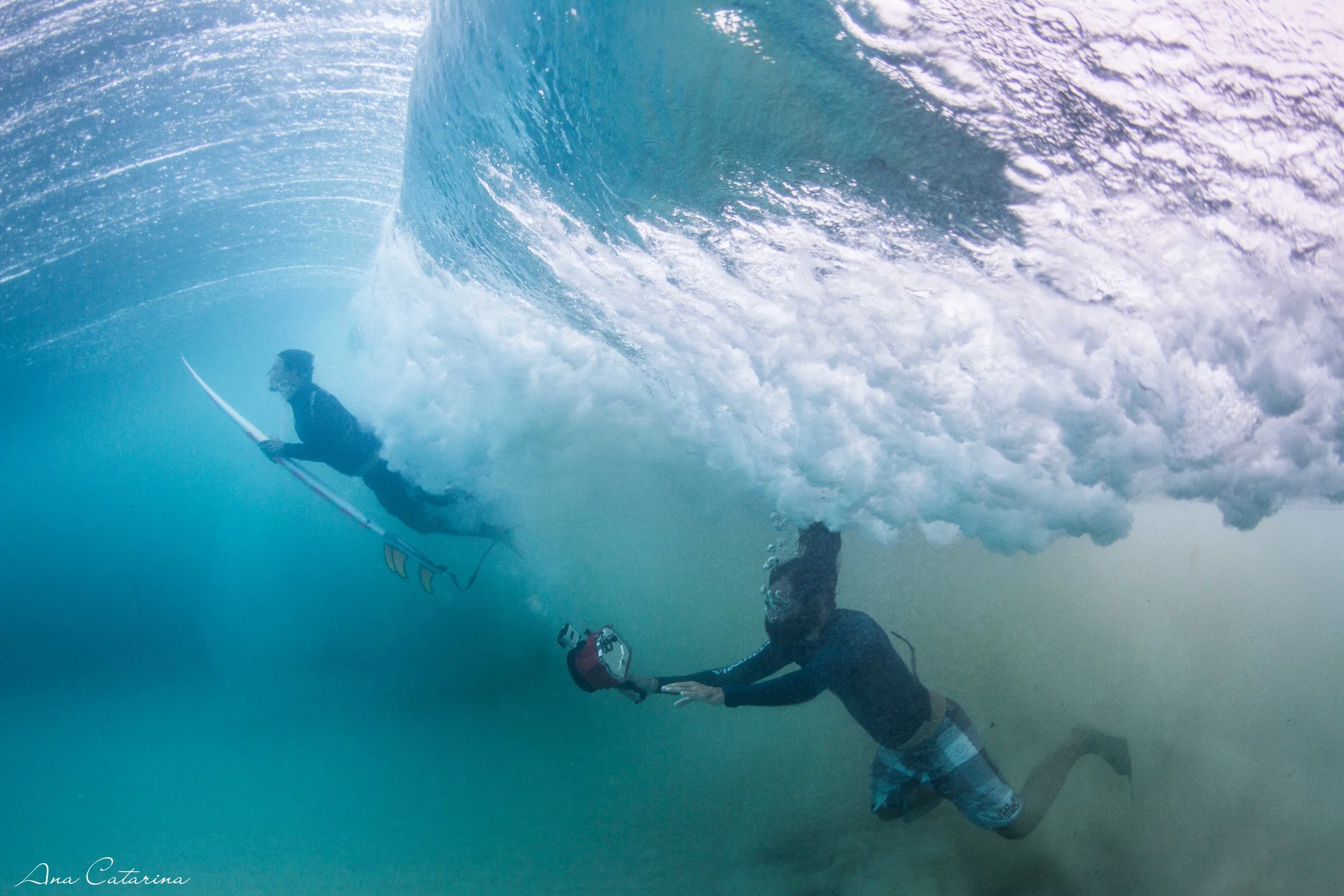 Daniel, de Ubatuba, um dos surfistas que conheci por lá e Iapa, o fotógrafo local / surfista / dono da marca 'Neuronha' varando a arrebentação.